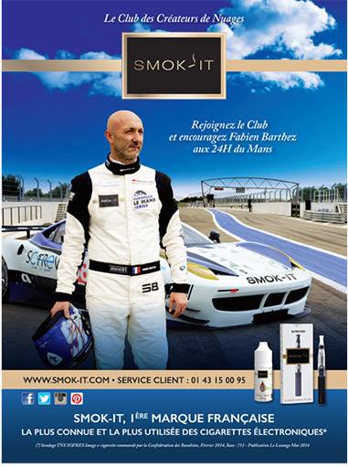 Smok-It, comptant parmi les intervenants de pointe du marché de la cigarette électronique, a investi dans le sponsoring sportif pour sa communication. Après la boxe, la marque se lance dans la course automobile, aux côtés de Fabien Barthez , engagé dans l’équipe Sofrev-ASP aux 24 heures du Mans.