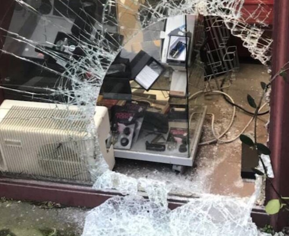 Il s’est mis à hurler ce qui a provoqué leur fuite par la vitrine brisée, le fond de caisse en poche.
