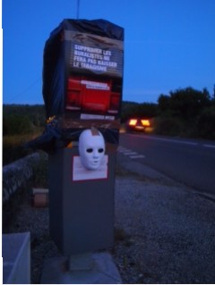 C’est en Ardèche, la nuit dernière, que les automobilistes ont découvert que les radars mis en place sur les principaux axes routiers étaient curieusement « décorés » (notre photo).