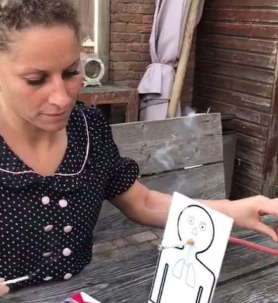 •• L’expérience n’est pourtant pas scientifique, comme l’admet elle-même l’association. Sur les images, une jeune femme utilise un carton blanc, affichant le dessin d’un fumeur dont on ne voit que les poumons et le visage. Sa bouche dessinée comporte un trou réel et derrière ce trou, dans lequel la bénévole glissera une cigarette allumée, est fixée une boite comportant un coton blanc, ainsi qu’une pompe pour recréer le mouvement d’inspiration et d’expiration du fumeur.