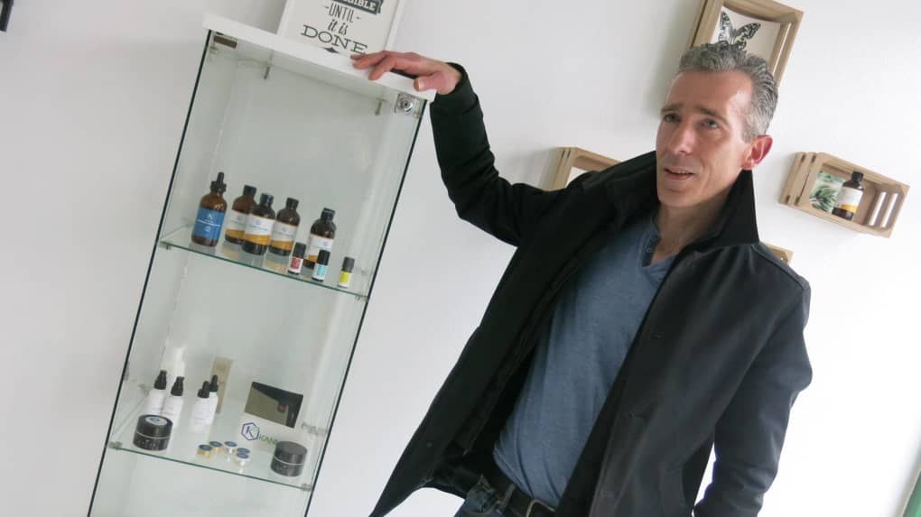 •• Autre caractéristique du showroom : « on ne vend rien en direct. Aucune vente ne se fait sur place. On renvoie sur une plateforme internet et les clients peuvent ensuite être livrés chez eux. On informe juste les clients au local et, dans notre vitrine, on expose des flacons et bouteilles vides : baume au CBD, crèmes, masques, exfoliants CBD, inhalateur CBD, huiles essentielles aux herbes asiatiques … Les prix vont de 4 à plus de 200 euros. »
