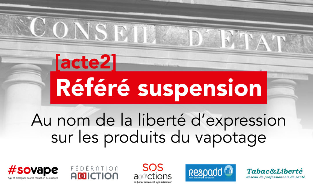 Les cinq associations (Sovape, Fédération Addiction, Respadd, SOS Addictions et Tabac & Liberté) – qui ont engagé un recours auprès du Conseil d’État pour faire annuler l’interdiction de la « propagande ou publicité, directe ou indirecte en faveur des produits du vapotage » (voir Lmdt du 21 juillet) – poursuivent leur action.