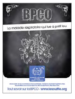 La campagne d’information « grand public » 2013, réalisée par la Fondation du Souffle, insiste sur le caractère mortel de la maladie (affiche à la tonalité volontairement sombre et un bandeau « La maladie respiratoire qui tue à petit feu »), avec une allusion visuelle sur sa cause première : le tabac. Il n’est pas sûr que ce choix graphique interpelle efficacement le grand public, alors qu’un sondage Opinion Way, réalisé pour la Fondation, révèle la totale méconnaissance de la maladie, et ce après dix ans de campagne d’information.