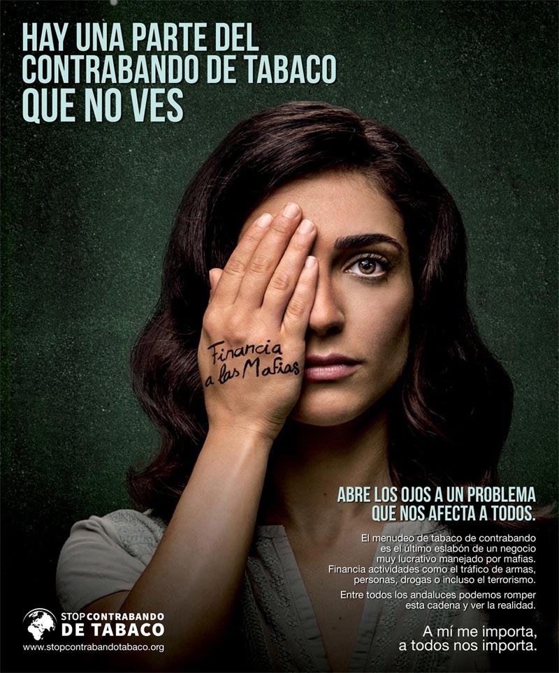 Texte : « Ouvre les yeux sur un problème qui nous concerne tous / La vente au détail de tabac de contrebande est le dernier maillon d’un commerce très profitable, sous contrôle des mafias / Il contribue au financement  d’activités comme le trafic d’armes, d’êtres humains, de drogue et même le terrorisme / Entre Andalous, nous pouvons démanteler cette chaîne et voir la réalité ». Signature : « C’est important pour moi, c’est important pour tous / Halte à la contrebande du tabac ».