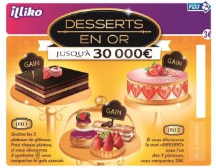 La Française des Jeux lance, ce lundi 13 mars, « Desserts en Or », son premier jeu de grattage … olfactif. 20 millions de tickets de ce jeu éphémère – au parfum de fraise – sont et vont être mis en vente dans le réseau de points de vente physiques pour une durée d’environ quatre mois.