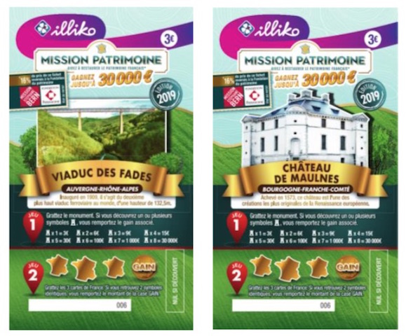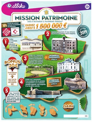 Le ticket de grattage à 15 euros, quant à lui, présente six monuments en péril, et permettra de remporter un gain maximum de 1,5 million d’euros. Rappelons que les jeux Mission Patrimoine ont pour objectif de financer 121 sites en péril, dont 18 sites emblématiques.