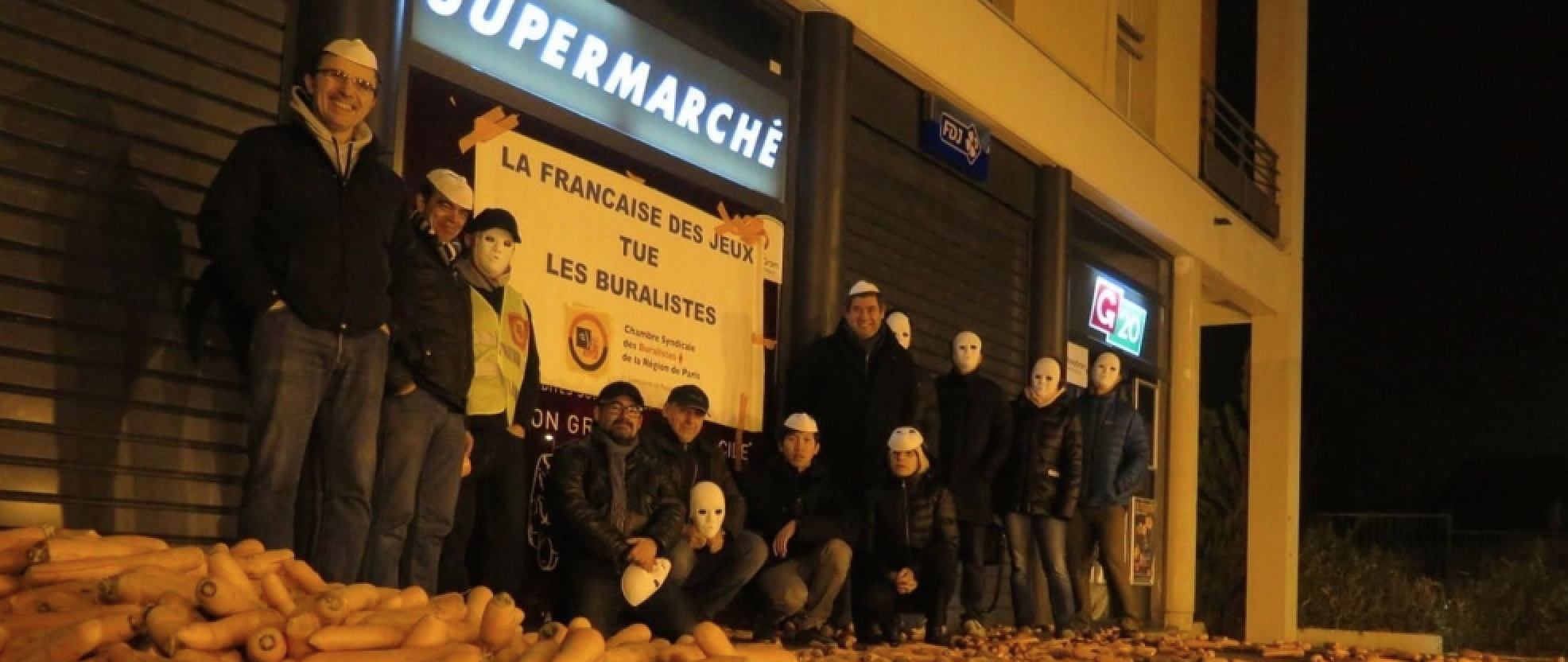 À 7 heures, ce samedi 3 décembre, une douzaine de buralistes ont surgi, masqués, devant un magasin G20 d’Éragny (Val-d’Oise) qui abrite un point de vente Française des Jeux. Pour y déverser 2 tonnes de carottes et y déployer une banderole.