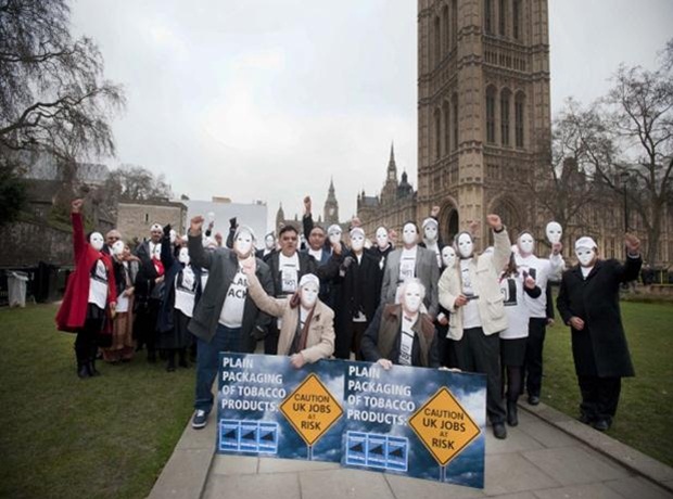 GB Manif Paquet neutreQuelques nouvelles complémentaires sur la présence animée, à Londres mercredi 11 février dernier, de vendeurs de tabac (tobacco retailers) portant et brandissant des « masques blancs » – exactement comme leurs collègues français, l’automne dernier – pour protester contre le projet de paquet neutre du gouvernement Cameron (voir Lmdt du 12 février).
