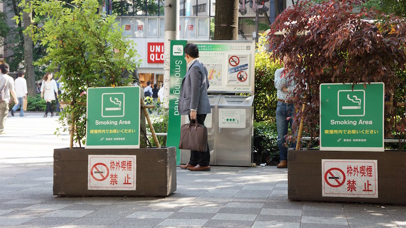 •• Au total, 243 municipalités au Japon, dont plusieurs arrondissements de Tokyo, ont restreint l’usage du tabac dans la rue depuis les années 2000, surtout pour des raisons de sécurité (risques d’incendie) et de « bonnes manières » – ne pas salir la chaussée en jetant les mégots par terre.