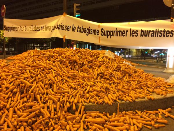 Plusieurs tonnes de carottes, en référence au symbole stylisé des bureaux de tabac, ont été déversées à Paris à proximité du ministère des Finances, au pied d’une large banderole clamant « Supprimer les buralistes ne fera pas baisser le tabagisme », ont constaté des journalistes de l’AFP.
