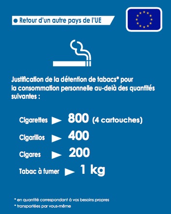 L’iconographie est claire sur les interdictions (drogues, contrefaçons en général) et les quantités de transport du tabac (retour d’un pays non membre de l’UE ou membre de l’UE).