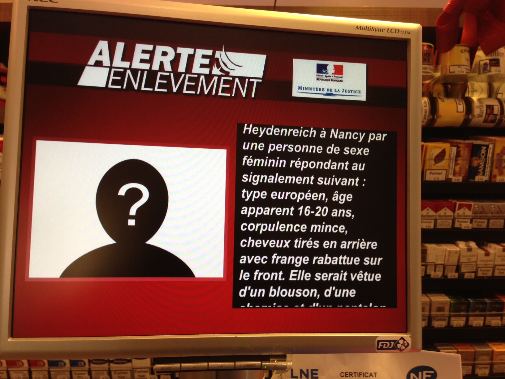 Les écrans qui se trouvent chez les buralistes ont largement diffusé, hier, « l’alerte recherche de personne », suscitée par un enlèvement d’enfant à Nancy.