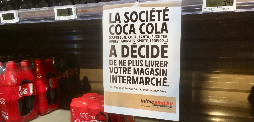 •• Mais au tournant de la nouvelle année, la célèbre entreprise de boissons a peu apprécié qu’Intermarché n’accepte pas de mettre en rayon la totalité de sa gamme de produits, et toutes ses marques : Coca-Cola, bien sûr, mais aussi Fanta, Sprite, Fuzetea, Honest, Tropico, Caprisun et Monster.