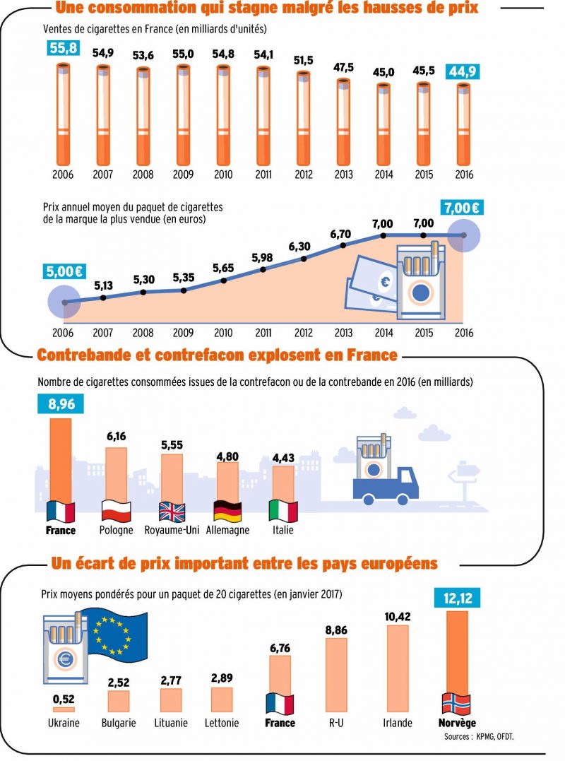•• « Les Français sont devenus les premiers consommateurs de tabac issu de la contrebande ou de la contrefaçon. Les achats aux frontières ont également bondi : 12,3 % des cigarettes fumées en France proviennent désormais des pays frontaliers … où les prix sont en moyenne de 1 à 2 euros plus bas. Agitant le chiffon rouge de l’emploi, les buralistes sont montés au créneau pour demander un nouveau plan d’aides. Or le secteur vit déjà sous perfusion : entre 2004 et 2015, 3,4 milliards d’euros de deniers publics lui ont été versés ».
