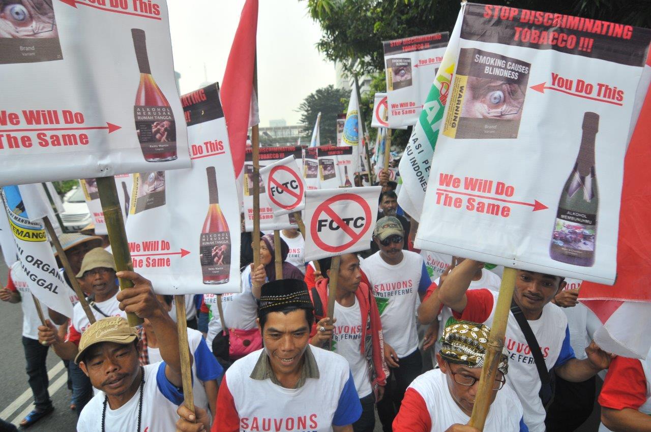 Répondant à l’appel de l’association des producteurs de tabac indonésiens (environ deux millions de personnes dans le pays), les manifestants réunis devant l’ambassade de France ont exhibé une grande banderole « paquet neutre – Contre !! », et des petites affiches suggérant que l’Indonésie pourrait répliquer en adoptant l’emballage neutre des bouteilles d’alcool pour les vins et spiritueux français commercialisés dans ce pays d’Asie du Sud-Est.