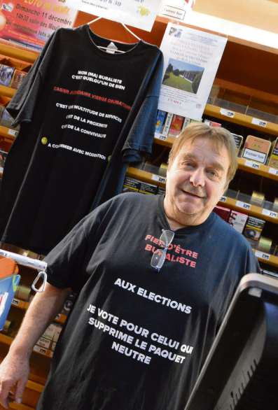 En arborant un T-shirt noir portant l’inscription « aux élections, je vote pour celui qui supprime le paquet neutre », le buraliste du village de Saint-Cézaire (Alpes-Maritimes) manifeste à sa manière sa grogne.