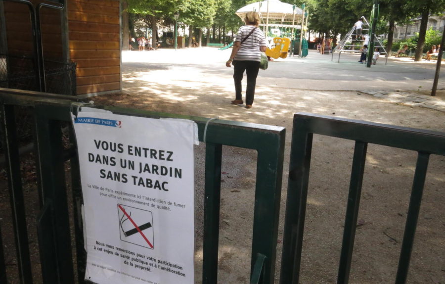À sa décharge, seule une des quatre entrées du square (et pas la principale sur la rue du Faubourg Saint-Antoine) arbore encore le panneau de la mairie de Paris annonçant « vous entrez dans un jardin sans tabac ». Les trois autres panneaux (dont il ne reste que les attaches en plastique) ont disparu.