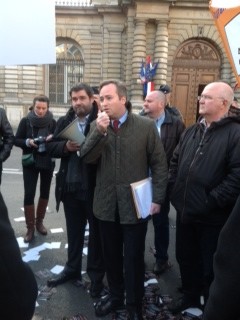 Il s’agit de Jean-Baptiste Lemoyne (jeune sénateur UMP de l’Yonne). Il s’est adressé aux manifestants pour témoigner de l’importance qu’il accordait au lien social représenté par les buralistes. Il a confirmé son opposition à l’amendement Delaunay et à « toutes ces mesures prises, de façon précipitée et sans concertation, qui risquent de porter un nouveau coup dur à la profession ».