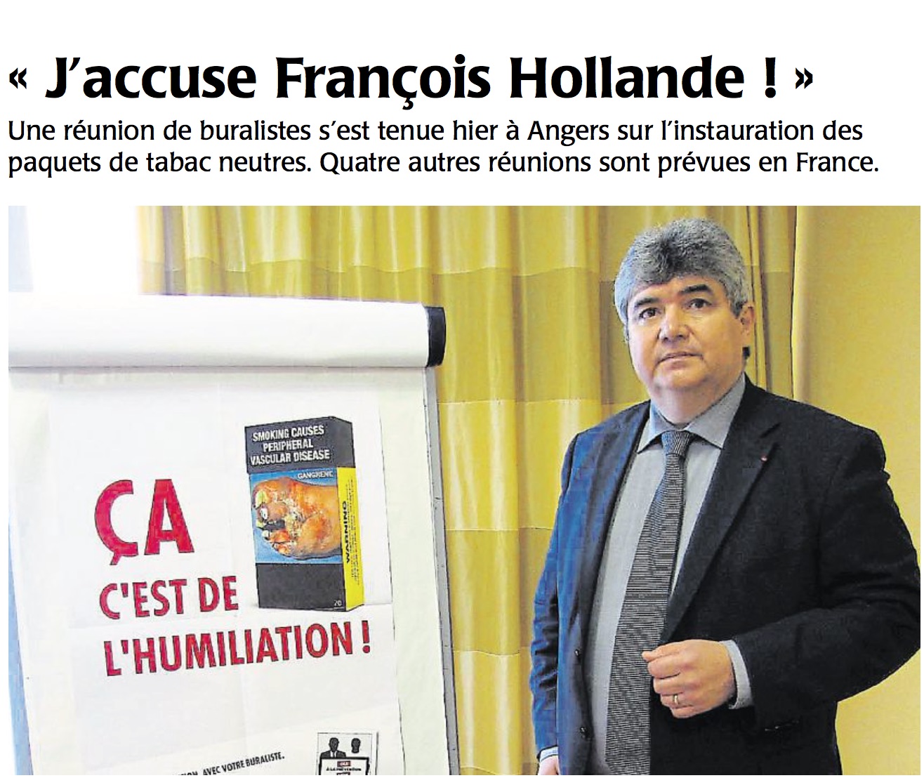 « J’accuse l’État de désespérer 26 000 petits entrepreneurs, soi-disant pour favoriser la santé publique. J’accuse le gouvernement et François Hollande de vouloir nous supprimer … Les politiques prennent la mauvaise cible, ce n’est pas les fumeurs qu’il faut stigmatiser, ni les buralistes ! Le gouvernement cherche à nous faire disparaître et a trouvé son bouc émissaire dans sa lutte contre le tabagisme ...